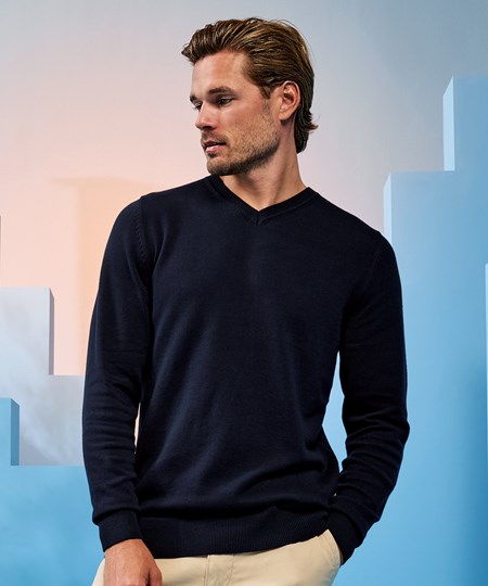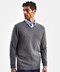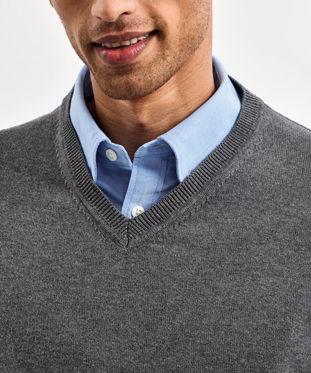 A great everyday sweater for men. The popular v-neck style allows for a shirt and tie to be visible underneath or can be worn without for a casual look. A patch on the underside reverse neck gives a stylish contrast effect. Decorative tuck stitching, ribbed knit on the neckline, cuffs and hem make for a classic and comfortable pullover for men.