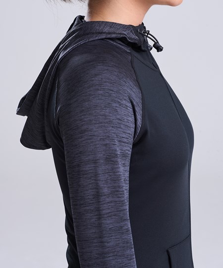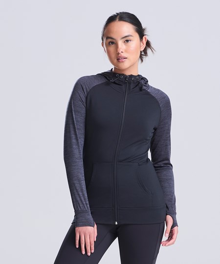 Push your limits with this innovative zoodie. Dual weight and supportive feminine fit allows you to focus on your workout goals. When the nights get chilly or you need a warm up hoody to throw on to and from the gym, the girlie cool contrast zoodie combines wicking performance with lightly brushed fabric on the body. Adjustable attached hood protects from the elements while the raglan sleeves and thumb holes offer great range of motion.