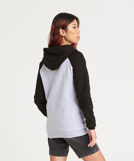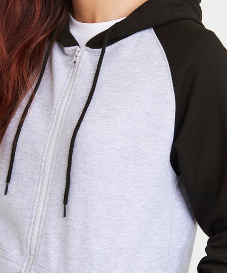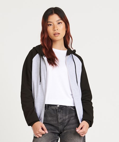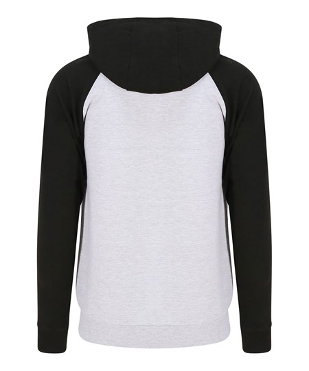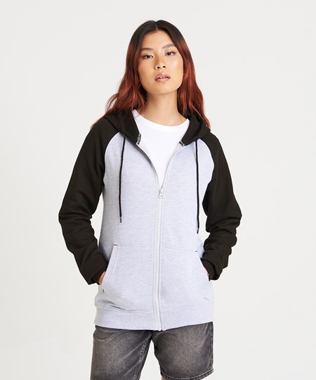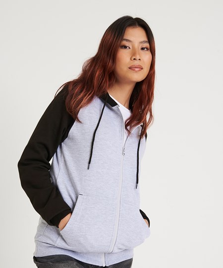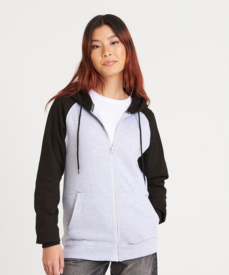 Add a casual layer with this zipped through hoodie. Features raglan contrast sleeves and hood. Relaxed fit, cotton faced fabric with double fabric hood. Wear with jeans for a versatile look.