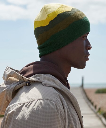 Whether you’re in mountainous high altitudes or back at ground level in the great outdoors, stay warm and protected in bold style. With its selection of mountainscape-inspired colourways, this beanie provides the perfect finishing touch to any outdoorsy ensemble – and, containing 100% recycled polyester.