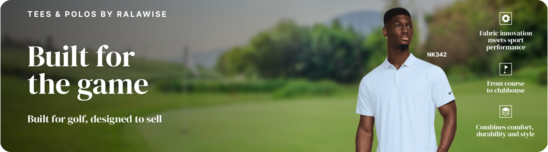 The Nike NK342 – Nike Dri-FIT moisture management with a clean, sport-smart silhouette. For clients building corporate golf day kits or premium branded leisure collections, the Nike brand does significant commercial work before the fabric spec is even discussed.