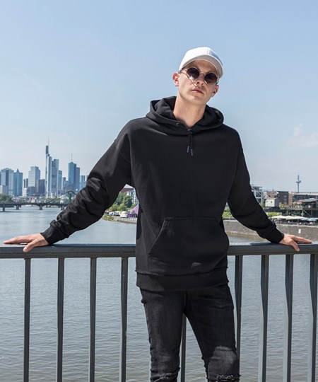 The oversize hoody combines classic sportswear with cool details: the soft sweatshirt material and the drop-shoulders ensure a casual fit. The broad ribbed cuffs with open edges, the kangaroo pocket and the hood with matching drawstring ensure the perfect urban look – with or without print. This item is manufactured in a FAMA Certified factory. FAMA stands for Facility and Merchandise Authorisation and is a high standard production certificate.