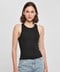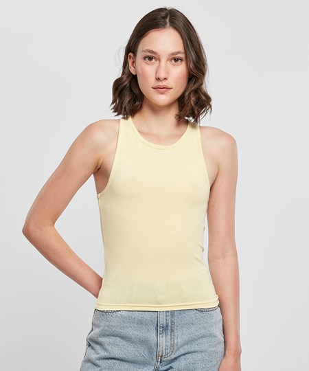 Equipped with a dynamic, sporty racerback cut, the otherwise plain, single-coloured women’s top sets a style statement. This women’s top offers a high crew neck on the front, while the cut is slim fit and the length is kept short. A pleasant wear is ensured by a material mix of cotton and elastane. The summery style can be individually refined further, either by flock or screen printing or with embroidery.