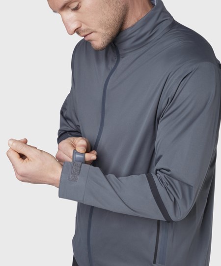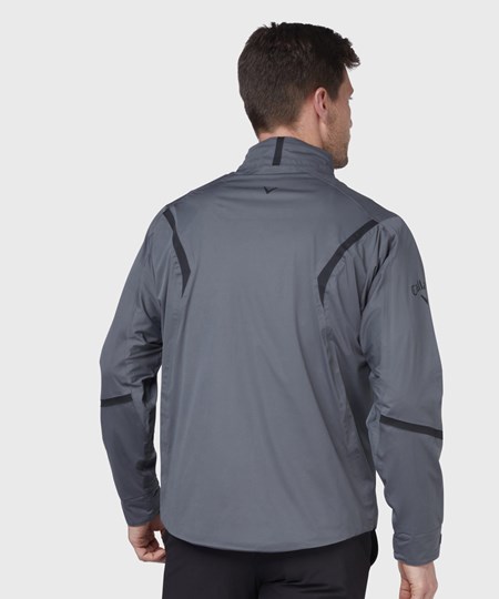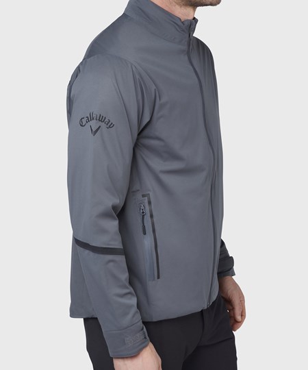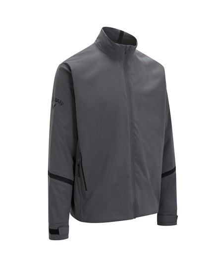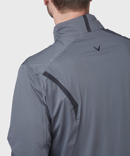 Fully-seamed waterproof jacket with adjustable hem and cuffs, featuring SwingTech technology and water-resistant zips. Includes Callaway print on the sleeve and Chevron print on back of neck.