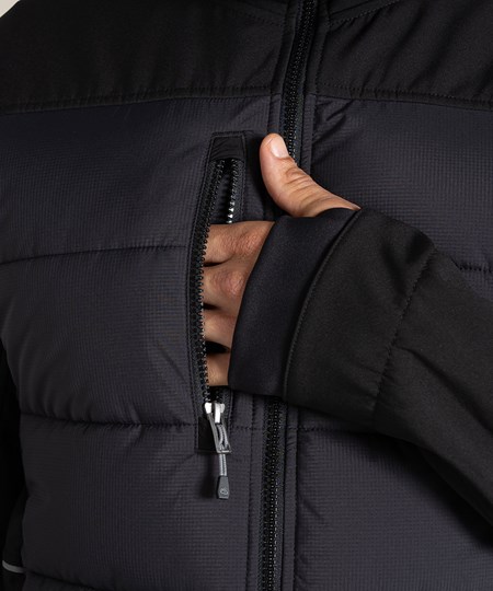 Designed to deliver effortless warmth in cooler conditions, this durable hooded jacket is a great workwear staple. Its stretch softshell construction features a snug microfleece back with baffled body panels for extra core insulation. The H2OShield DWR finish helps to shrug off showers, while odour-control panels help keep you fresh.