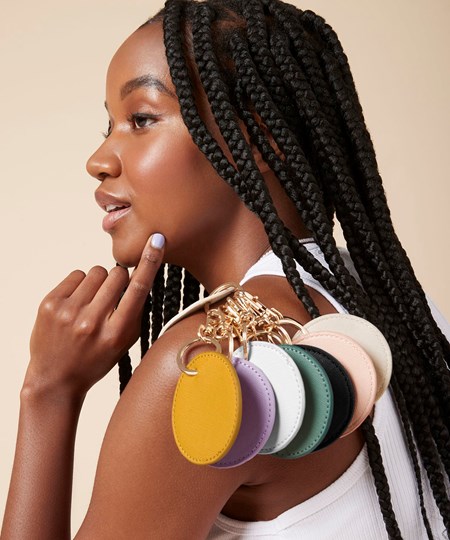 Personalisieren Sie Ihre Boutique-Kollektion mit diesen austauschbaren und anpassbaren Schlüsselclips. Dieses Design im 100 % Lederlook kann als Schlüssel- oder Taschenanhänger verwendet werden und wurde für eine einfache Veredelung entworfen. Feiner Saffianostoff verleiht dem Anhänger ein luxuriöses Finish und der hochglänzende goldfarbene Metallschlüsselclip ergänzt die Premiumqualität. Auch in rechteckiger (BG744) und herzförmiger (BG746) Ausführungen erhältlich.