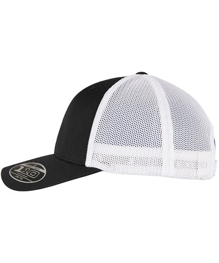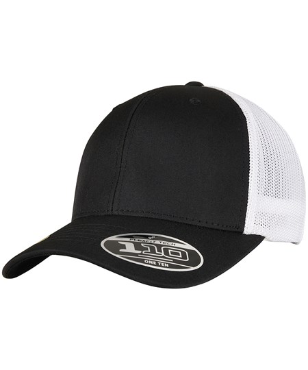 Die zweifarbige Trucker Cap bringt beides zusammen. Das rückseitige, transparente Mesh und die blickdichte Vorderseite der Cap bestehen jeweils aus recyceltem Polyester – für einen angesagten Look und ein gutes Gewissen. Zur klassischen Optik der Trucker Cap in Schwarz-Weiß gibt es natürlich den vorgebogenen, achtfach abgesteppten Visor dazu sowie hervorragenden Tragekomfort durch den Einsatz gleich zweier Technologien: integriertes Flexfit-Band für besten Halt und einen farblich passenden Snapback-Verschluss zum individuellen Einstellen der Größe.