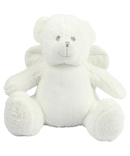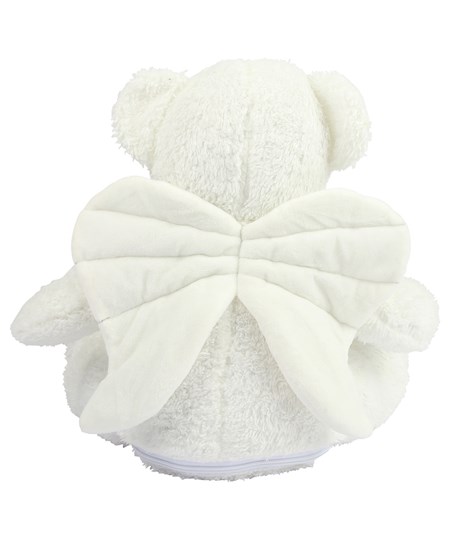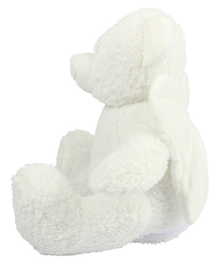 Der weiche Plüschengel mit Reißverschluss hat himmlische, cremefarbene Flügel mit Reißverschluss auf der Unterseite für Dekorationen am Bauch.