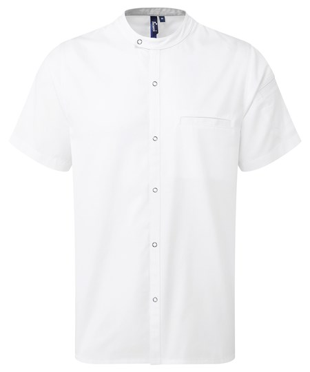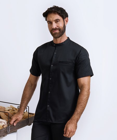 Dieses moderne Kochhemd mit Stehkragen kombiniert die Haltbarkeit einer Kochjacke mit der Leichtigkeit eines Hemdes. Es hat einen asymmetrischen Mandarin-Kragen mit Druckknöpfen vorne für einfaches Tragen, während ein kontrastierendes inneres Halsband hilft, Flecken vom täglichen Gebrauch zu verbergen. Die Tasche kann für Stickereien verschoben werden. Hergestellt aus einer Kombination von zertifiziertem recyceltem Polyester und Baumwolle.