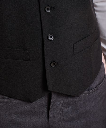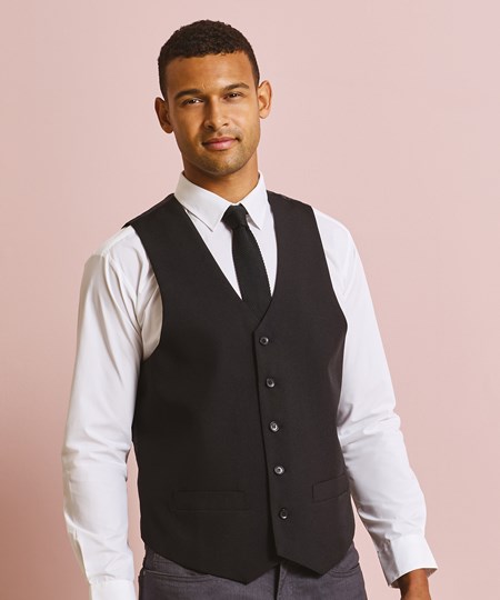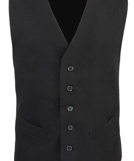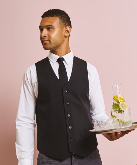 Diese Herren-Weste mit fünf Knöpfen und zwei praktischen Leistentaschen ist ein besonders elegantes Kleidungsstück für die Gastronomiebranche. Diese Weste ist durchgehend gefüttert und mit einem Satin-Rückenteil mit einer Rückenschnalle ausgestattet.