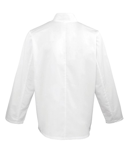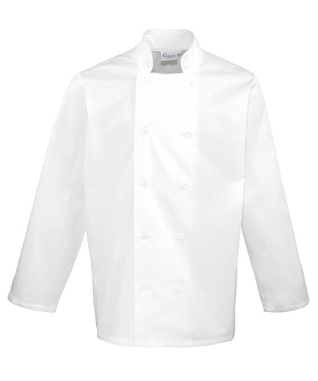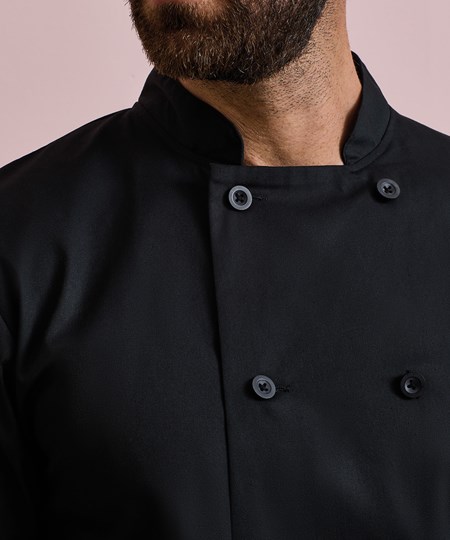 Eine pflegeleichte Kochjacke mit langen Ärmeln und Wickelverschluss mit zehn Knöpfen. Um den Anforderungen wiederholten Waschens standzuhalten, bestehen die Knöpfe aus langlebigem Kunstharz. Eine elegante Jacke für Köche mit Stehkragen für einen stromlinienförmigen Look. Erhältlich in Schwarz, Weiß und Stahl in einer Vielzahl von Größen.