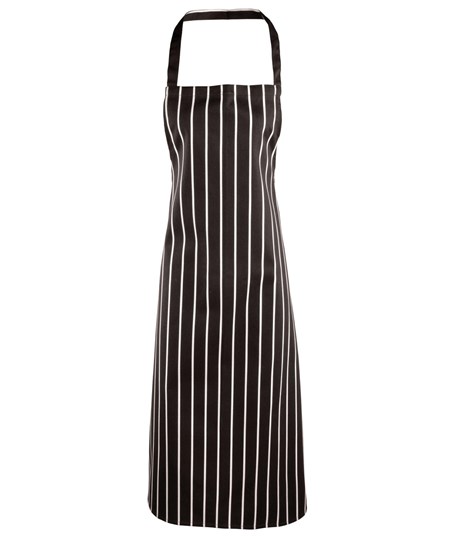 Diese Metzger-Latzschürze ist in traditionellen Branchen besonders beliebt, bietet hervorragenden Schutz und ist mit vertikalen Streifen geschmückt. Das Streifenmuster wird an der Halsschlaufe und an den Bindebändern fortgesetzt.