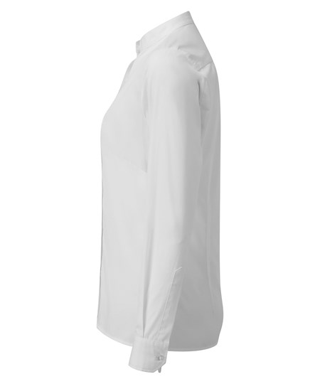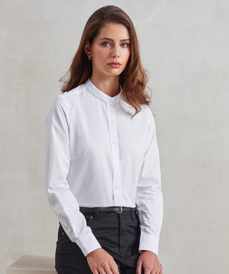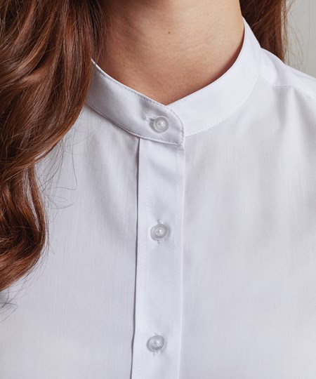 Dieser klassische Hemdenstil ist eine willkommene Erweiterung unserer Hospitalitywear-Kollektion und für Servicepersonal sehr beliebt. Der markante Stehkragen wird vorne mit einem Knopf geschlossen. Die Ärmel haben Manschetten mit zwei Knöpfen, können aber auch lässig hochgekrempelt werden. Abnäher an Brust und Rücken sowie ein abgerundeter Saum ergeben eine attraktive, feminine Silhouette.