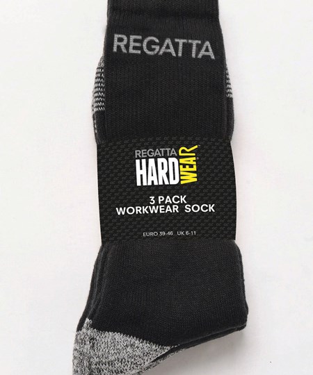 Diese Herren-Arbeitssocken aus Baumwolle, Polyester und Elasthan vereinen Komfort, Langlebigkeit und Dehnbarkeit. Dank der mit Schlingenstich gepolsterten Fersen- und Zehenpartie sind diese Socken ideal für alle, die den ganzen Tag auf den Beinen sind. Die Rippstrick-Knöchelbündchen sorgen für zusätzlichen Halt und die nahtlos verarbeitete Zehenpartie garantiert optimalen Komfort.
