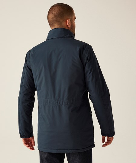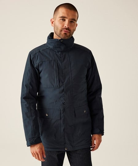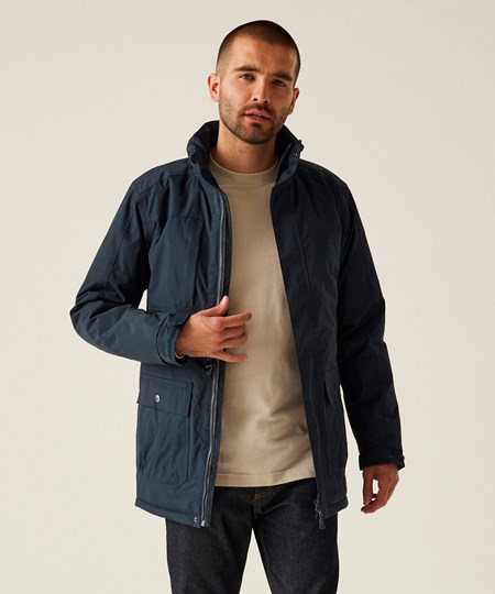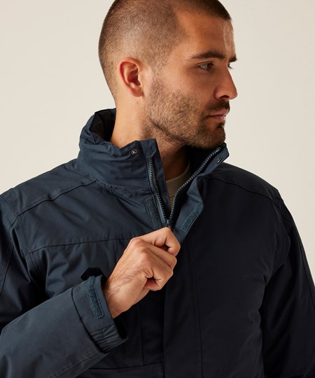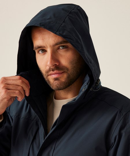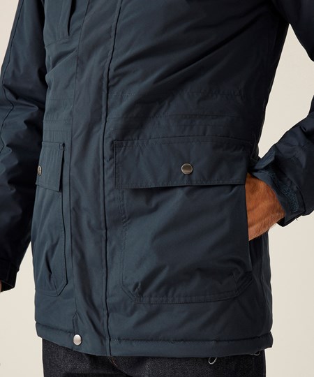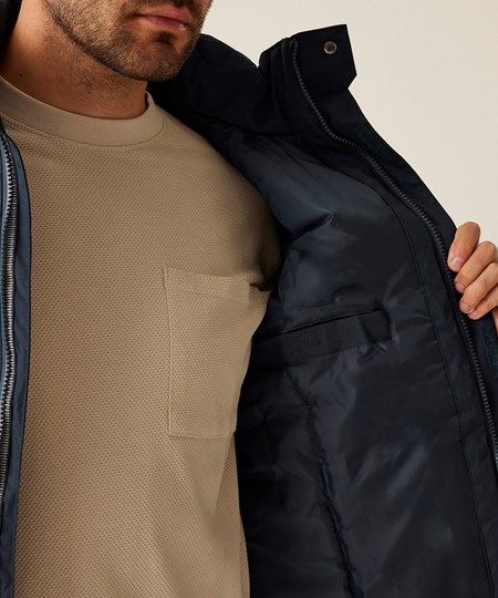 Verdeckte Kapuze mit Verstellmöglichkeiten, verstellbare Ärmelbündchen, 2 untere Taschen mit Handwärmern und 2 untere Cargotaschen, Handytasche, innere Sicherheitstasche und Brusttasche mit Reißverschluss, verdeckter Reißverschluss im Futter für den Stickzugang, köpernahe Passform.