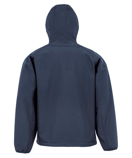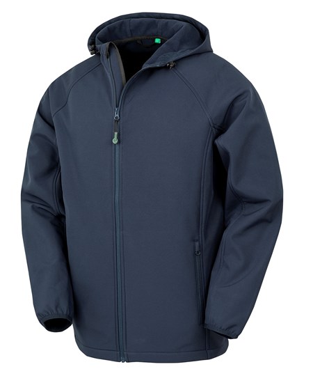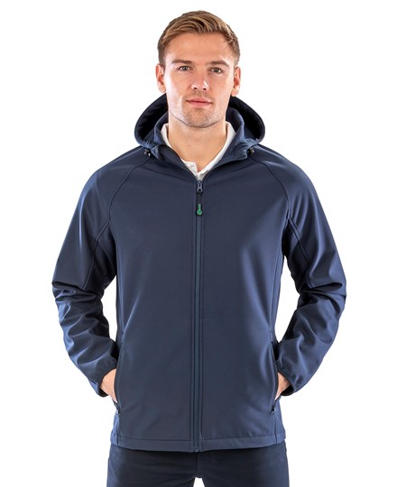 Eine hochwertige, moderne Softshell-Jacke für Herren mit Kapuze und toller Passform aus recyceltem Material
