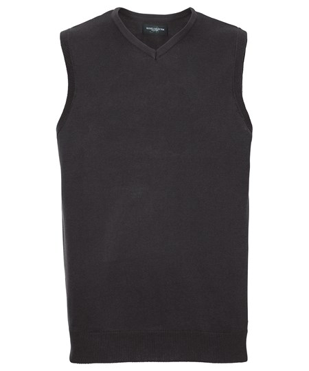 Die ärmellose Version des klassischen Russell-Pullovers mit V-Ausschnitt – perfekt mit Hemd oder T-Shirt kombinierbar.