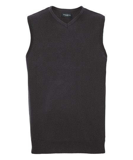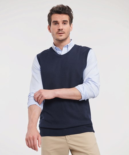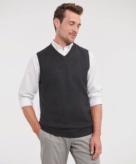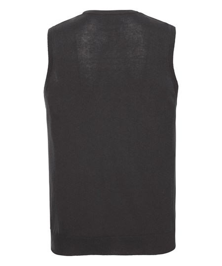 Die ärmellose Version des klassischen Russell-Pullovers mit V-Ausschnitt – perfekt mit Hemd oder T-Shirt kombinierbar.