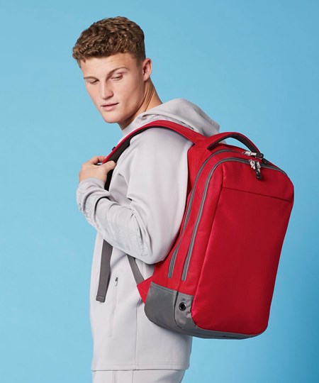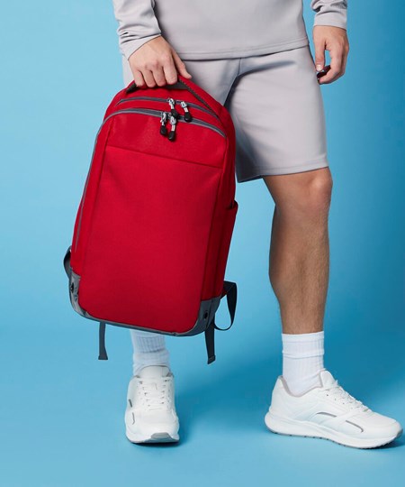 This ergonomic design features a breathable padded mesh back panel and adjustable straps for everyday comfort. Water-resistant polyester fabric helps protect against the elements and comes in a choice of athletic colourways. The easy access, asymmetric opening allows for simple decoration, while the shoulder strap mounted wireless headphone holder keeps your sports essentials close at hand. External bottle pocket, padded grab handle and attachment clip make this a go-to athleisure accessory.