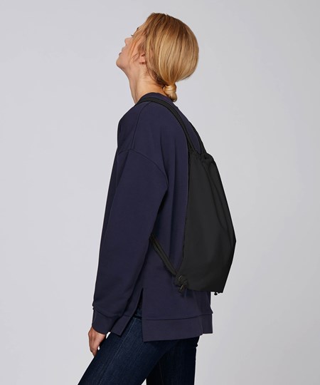 The woven gym bag is cut in premium 300gsm 80% reclaimed cotton, 20% recycled polyester and features clean and reinforced finishes.