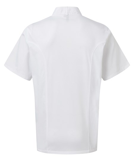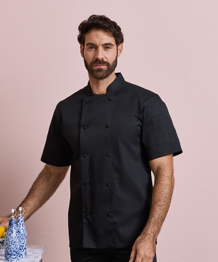 Veste de cuisinier à manches courtes fabriquée dans notre tissu exclusif Coolchecker®. L’empiècement central au dos est fabriqué dans le tissu Coolchecker® aux propriétés exceptionnelles d'évaporation rapide de la transpiration et de gestion de l'humidité, pour aider le cuisinier à rester au frais pendant toute la durée du service. Fermeture portefeuille avec dix boutons dans la continuité du tissu, col Mao et double poche à crayon bien pratique en haut du bras gauche.