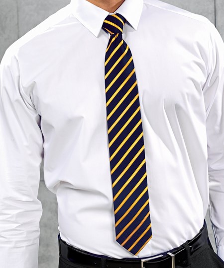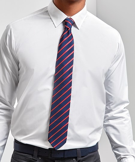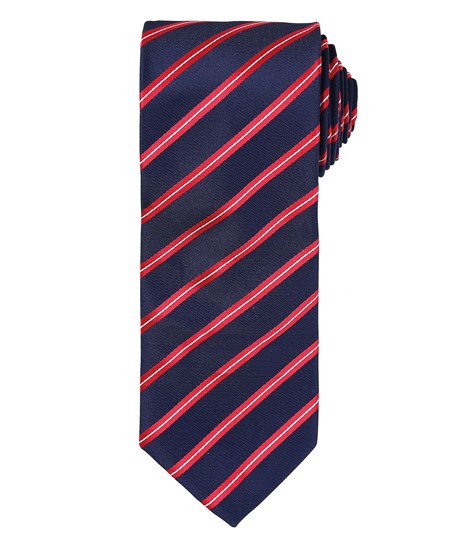 Cravate à rayures type sport, un classique traditionnel reconnu pour les tenues d’équipe qui doivent avoir un look harmonieux. Les rayures fines sont tissées à travers toute la longueur de la cravate pour un style agréable à l’œil.