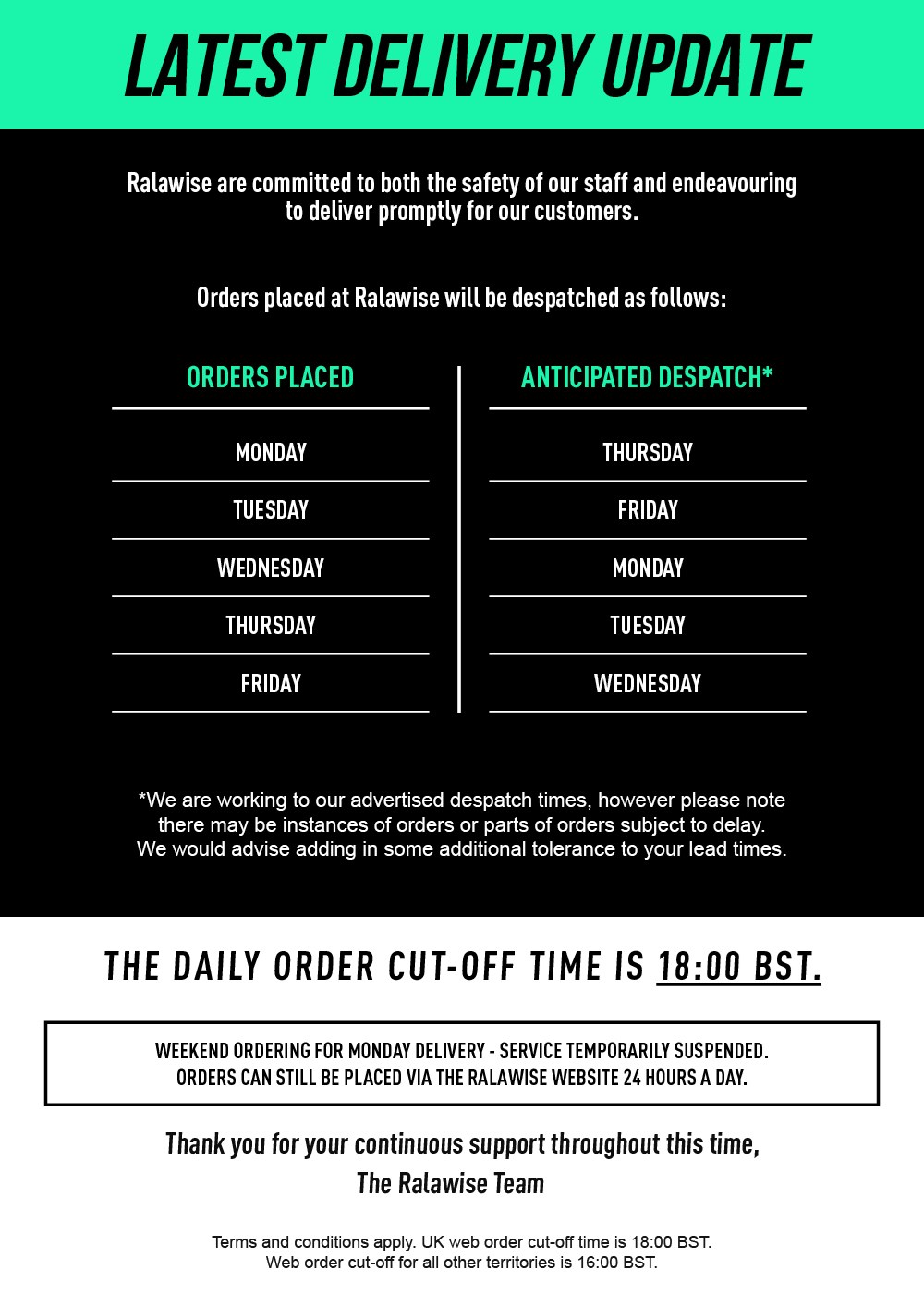 Our teams are still working to guidelines issued, maintaining a Covid-secure environment for our employees and orders will continue to be despatched within the timescales detailed opposite.