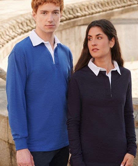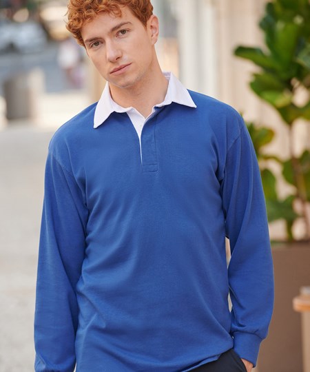 The long-sleeved plain rugby shirt has ample space to display a bold slogan, logo or crest making it perfect for everyone from fashion brands to traditional clubs. Made from 100% cotton it has a traditional woven rugby collar, taped shoulders, self-fabric facing on side vents and elastane reinforced cuffs exemplary of the quality design detail Front Row is known for.