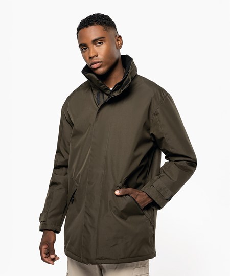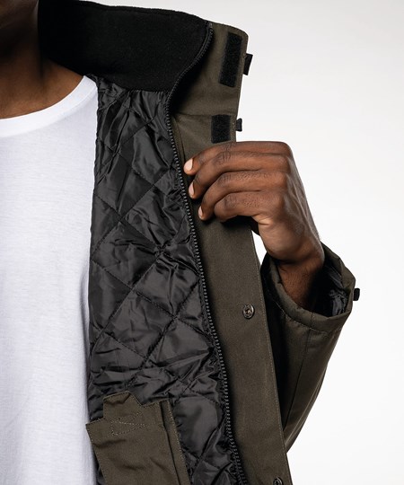 100% polyester Oxford outer - quilted polyester padding and lining. Zip fastening with tear release fastening and concealed press studs. 2 zipped outer pockets. 2 inside pockets (1 mobile phone pocket). Concealed hood. Fleece-lined collar. Zip access for decoration.