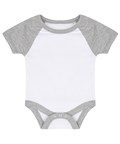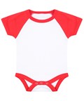 Retro styling baseball bodysuit with contrast sleeves and binding on neck and leg opening. YKK popper fastening at bottom for ease of access and size tab only for easy relabelling.