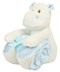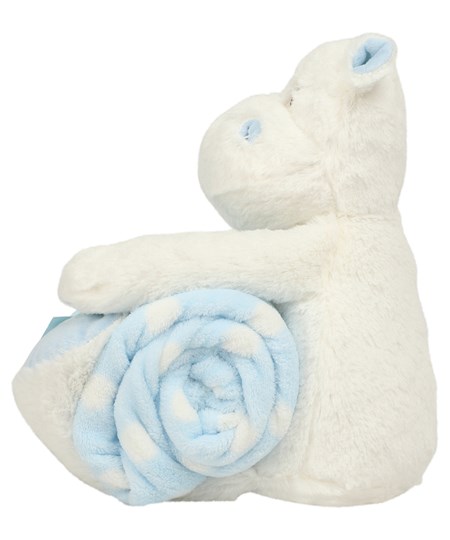 Super soft white fur coats the hippo toy with little hints of blue or pink to suit any little ones or a new born. Rolled up, clutched under the hippo’s arms is a cuddly comfort blanket with an adorable spot print, perfect to embroider or print names onto.