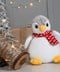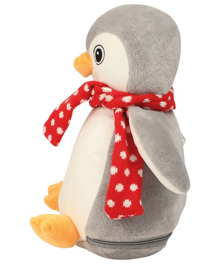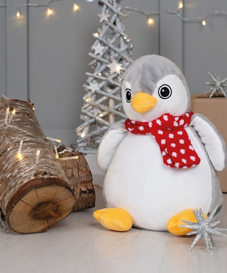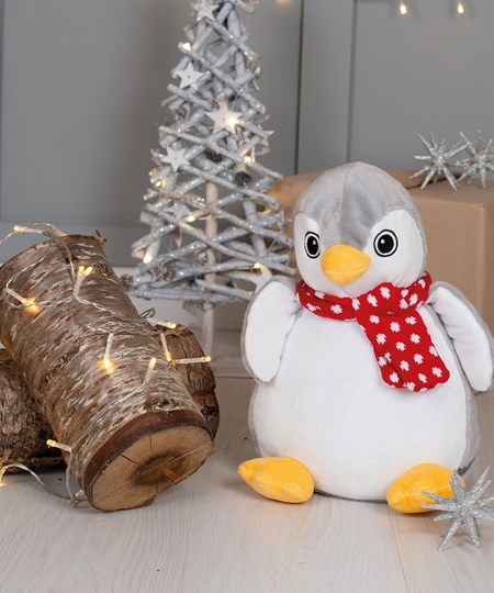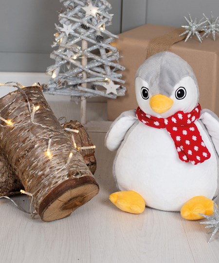 Flying in for warm winter cuddles, the plump penguin has a bright orange beak and feet. Adding character is a woolly scarf with ditsy white spots tied around the neck. A zip around the toy base gives access to embroider the snowy white tummy.