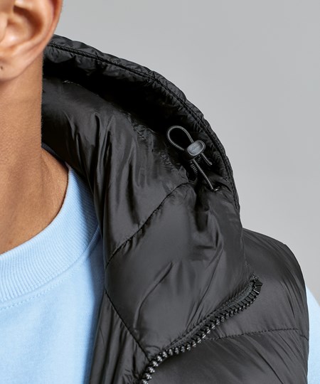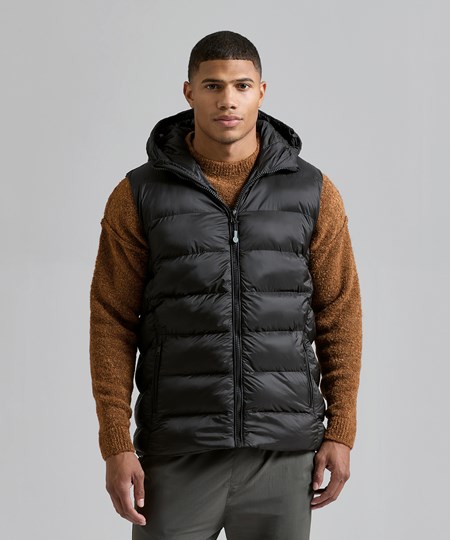 De gerecyclede Solitude-bodywarmer met capuchon is ontworpen om warm te houden. Het gewatteerde ontwerp met modern V-vormig stikwerk aan de zijkanten is zowel stijlvol als isolerend. De verstelbare capuchon en zoom zorgen voor een aansluitende pasvorm op maat, ideaal om warmte vast te houden tijdens koudere dagen. De bodywarmer kan gemakkelijk over een T-shirt, sweater of polo gedragen worden en is zo een essentiële aanvulling op de garderobe van elke man.