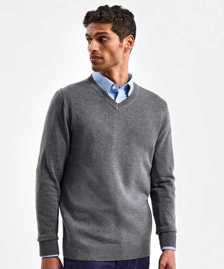 Een geweldige alledaagse trui voor mannen. De populaire v-nek zorgt ervoor dat hemd en das zichtbaar blijven. Maar voor een meer casual look kan deze ook los gedragen worden. Een patch op de onderkant van de achterzijde van de nek voor een contrasteffect. Decoratieve tuckstiksels, geribde gebreide neklijn, manchetten en zoom maken van deze trui een klassieke en comfortabele pullover voor mannen.