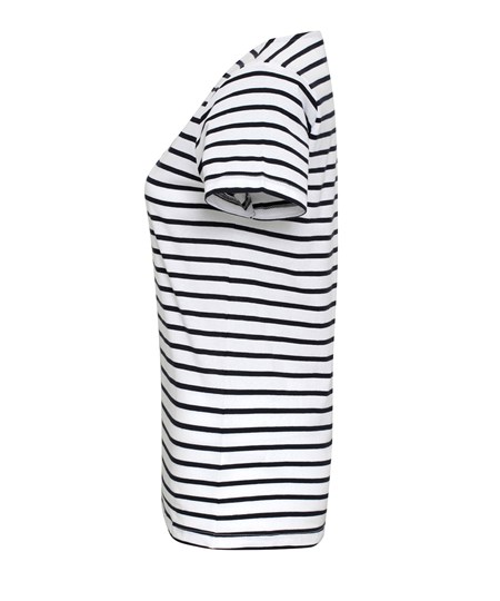 Dit marine t-shirt met korte mouwen voor dames heeft dezelfde klassieke stijl als het origineel, maar dan met korte mouwen. Deze korte mouwen-stijl is simpel, maar toch een elegante update voor iedere damesgarderobe.