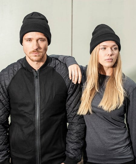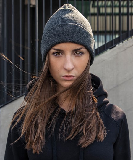 De coole heavyknitbeanie is een veelzijdig item dat met allerlei looks te combineren is. Het dichte breisel is licht elastisch, zodat het goed aansluit rond je hoofd. De brede, omgevouwen rand is ideaal voor flock of borduursel.