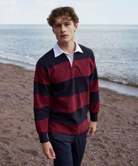 Dit altijd populaire rugbyshirt van hoogwaardige, zware jersey heeft gestreepte panden, een traditionele geweven kraag en geribbelde manchetten. Het shirt heeft verder getapete schouders en zijventilatie en is duurzaam. Zorgvuldig geselecteerde stoffen en slimme afwerking, kenmerkend voor Front Row and Co. Het shirt biedt daarnaast ruim plaats aan een stoere slogan, logo of wapenschild.