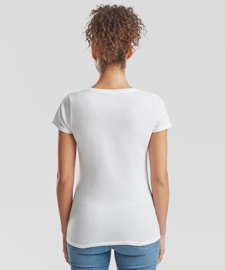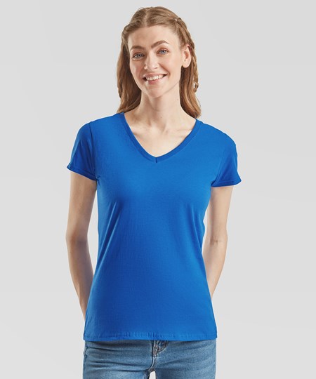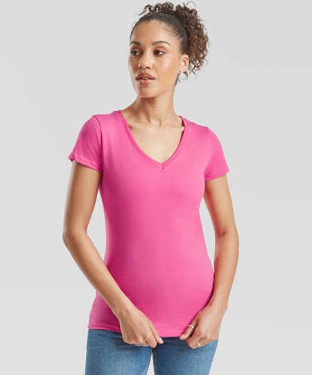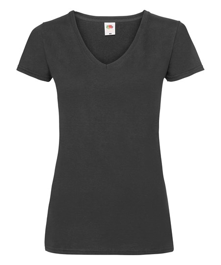 Met een fijngebreide steek voor een betere bedrukbaarheid is het dames Valueweight T-shirt met v-hals ideaal voor allerlei soorten kledingdecoratie en biedt voorgevormde zijnaden voor een vrouwelijke pasvorm en een v-hals met katoenen/Lycra® afgewerkte halslijn met bies voor beter draagcomfort. Het dames Valueweight T-shirt met v-hals van Fruit is verkrijgbaar in een groot aantal kleuren.