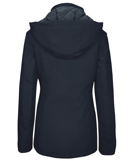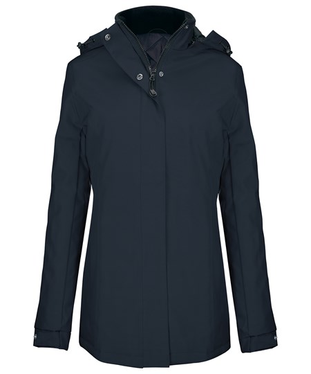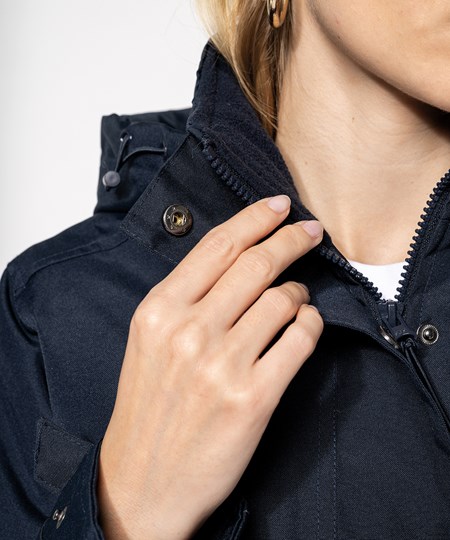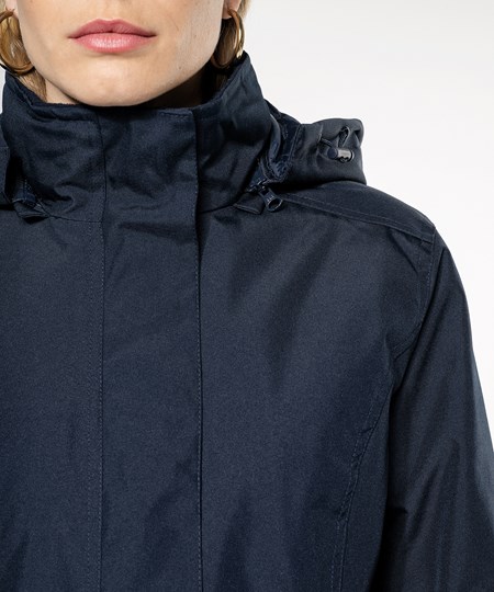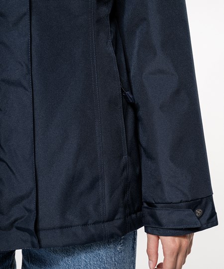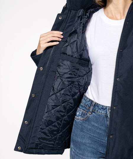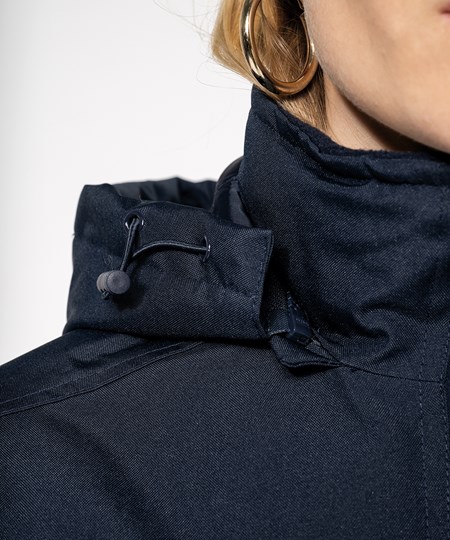 Buitenkant: 100% oxford polyester. Binnenkant: gewatteerde polyester. Ritssluiting met overslag en onzichtbare drukknopen. 2 ritszakken aan de buitenkant. 1 binnenzak. Afneembare capuchon. Kraag met fleecevoering. Drukkersrits.