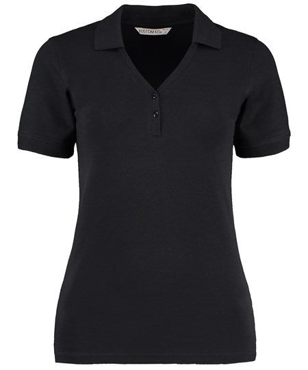Een relaxte, aansluitende stretchpolo gemaakt van een mix van katoen en lycra met een vrouwelijke V-hals en sluiting. Verkrijgbaar in een groot aantal heldere kleuren.
