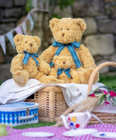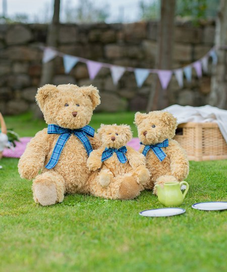 Ga naar de teddyberenpicknick met de Bracken-beer, met lichtbruine vacht en een charmant blauw geruit lintje.