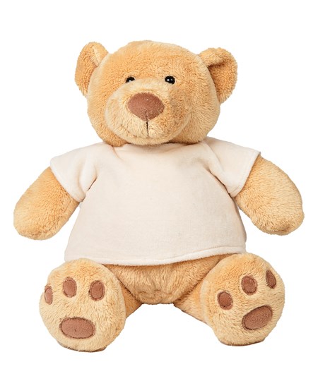 Ga naar de teddyberenpicknick met de honingbeer, met zijn honingkleurige, zachte pluchen stof in een crèmekleurig T-shirt.