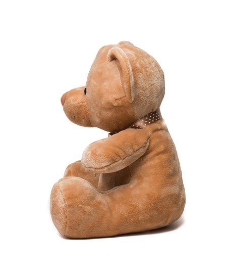 De Velvet-beren gaan goed gekleed! Met een bruin en crèmekleurig stippellint, met meer Mumbles-kleding verkrijgbaar in de maten small, medium en large.