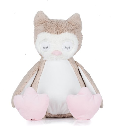 Kruip lekker in bed met onze pluchen Zippie-uil met zijn zachte, contrasterende roze neus en poten. De buik kan eenvoudig worden gedecoreerd via een ritsopening voor borduurwerk en sublimatiedruk.