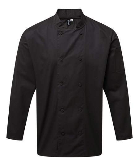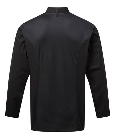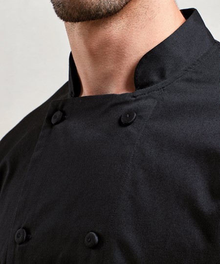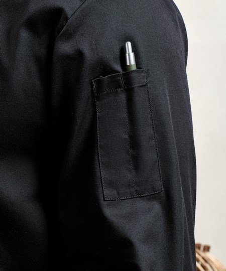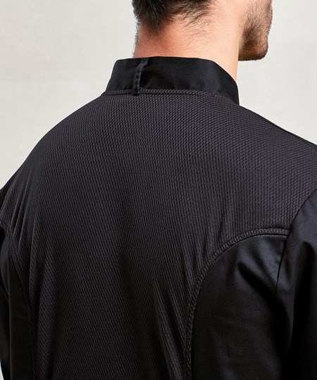 Een koksbuis vervaardigd met Coolchecker® stof. Het pand in het midden van de rug is gemaakt van Coolchecker® stof dat uitstekend vocht reguleert en afvoert om de kok koel te houden tijdens het werk. Met overslagsluiting met tien knopen van dezelfde stof, opstaande kraag en handige dubbele pennenzak op de linkermouw.