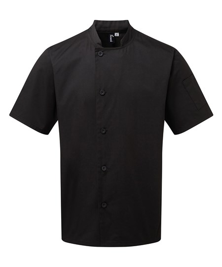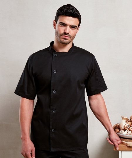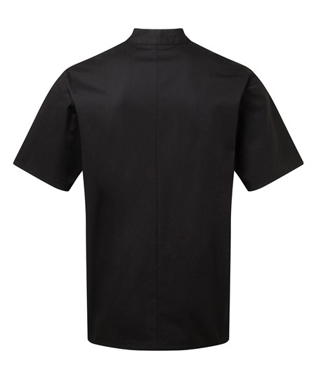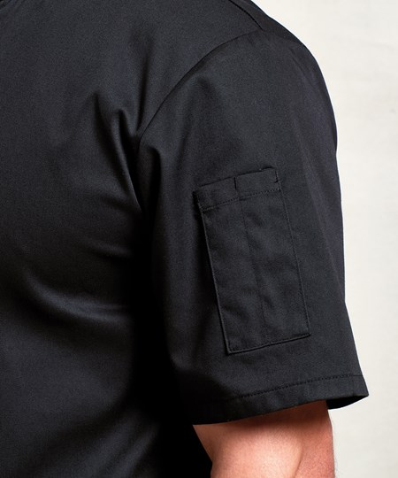 Een duurzame koksbuis met korte mouwen die sluit aan de rechterkant met vijf duurzame knopen van kunsthars. Op de linkermouw een dubbele pennenzak. Deze koksbuis is uitgevoerd met een opstaande kraag, is verkrijgbaar in zwart en wit en heeft een uitstekende prijs-kwaliteitsverhouding.
