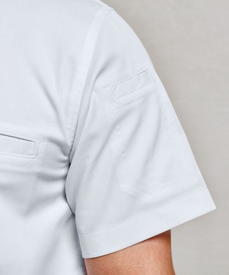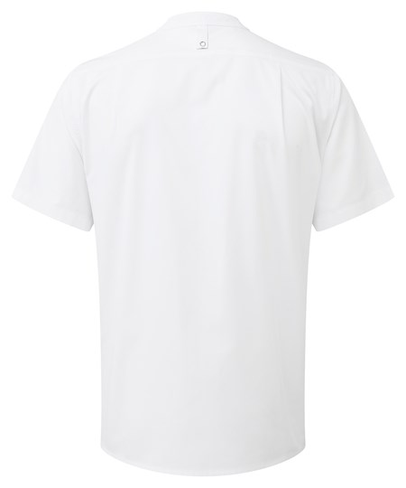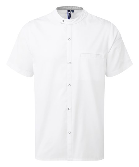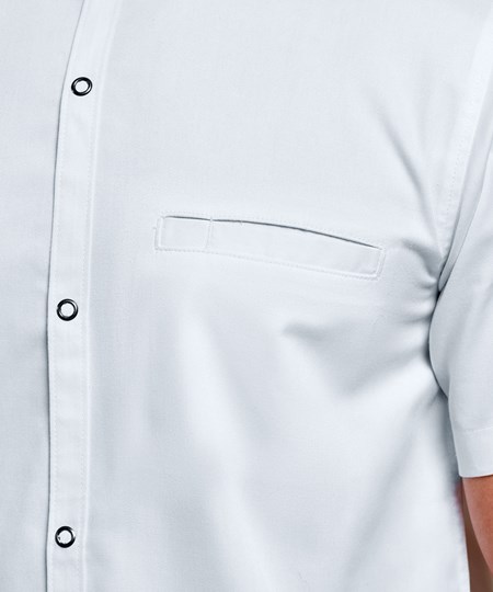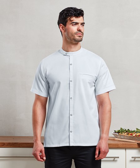 Dit moderne kokshemd met bandkraag combineert de duurzaamheid van een koksjas met het lichte karakter van een overhemd. Het heeft een asymmetrische mandarijnkraag met drukknoopsluiting aan de voorkant voor gemakkelijk dragen, terwijl een contrasterende binnenkraag helpt om vlekken van dagelijks gebruik te verbergen. De zak kan worden verplaatst om borduurwerk mogelijk te maken. Gemaakt van een combinatie van gecertificeerd gerecycled polyester en katoen.