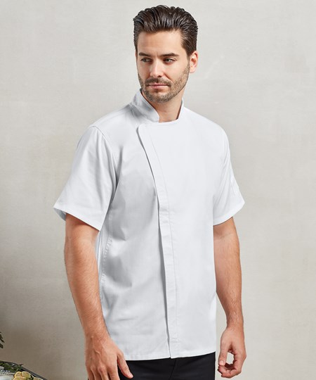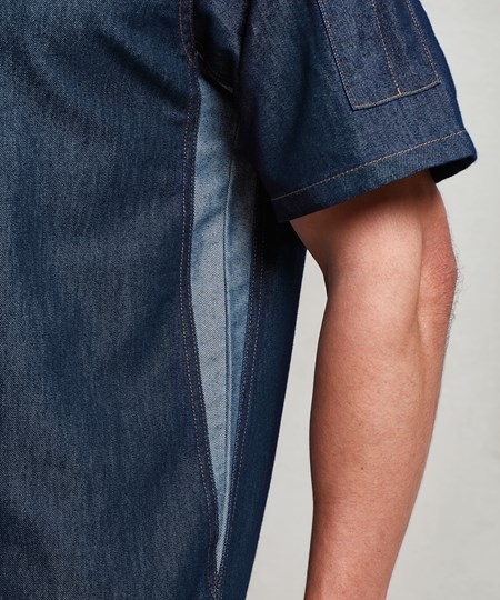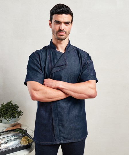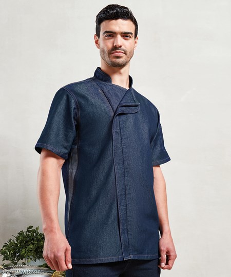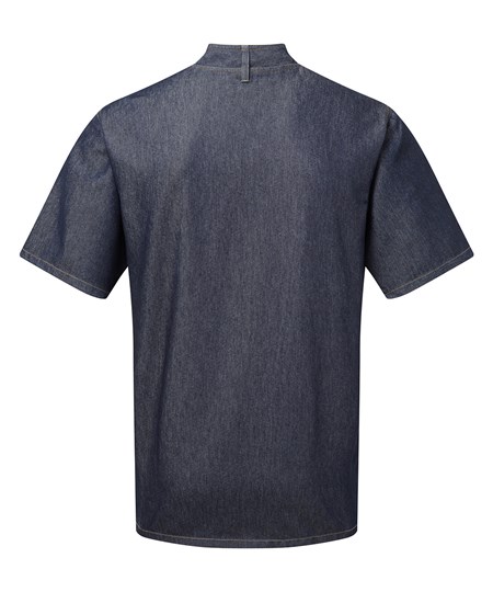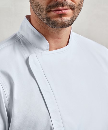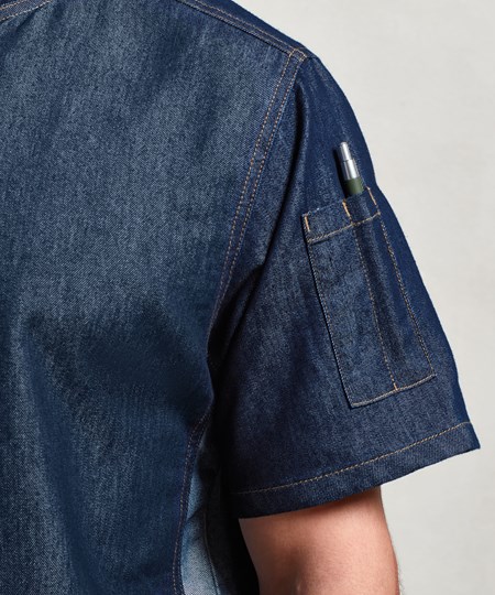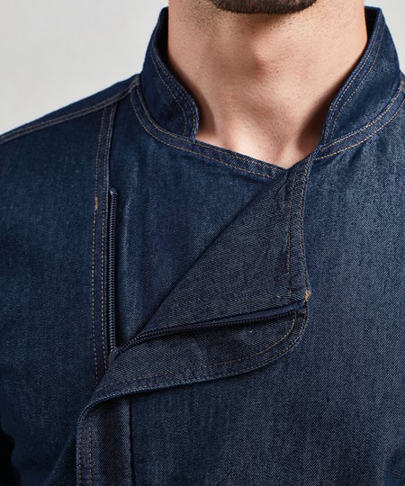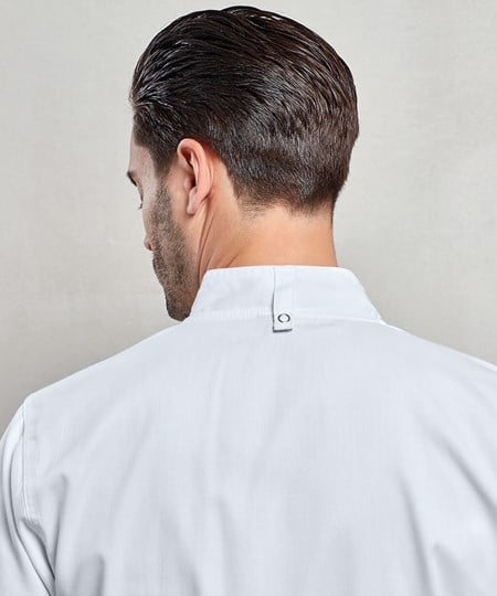 Een comfortabele koksbuis die makkelijk aan te trekken is door de verborgen ritssluiting. De twee denim versies hebben stukken in contrasterende kleuren onder de armen en op de zijkant, terwijl de witte versie een ademend gaasstuk onder de arm heeft. Afgewerkt met een opstaande kraag en zijsplitten voor de typische stijl die in veel keukens te zien is.