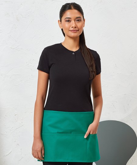 Deze 2 in 1 "kleurencollectie-schort" biedt de drager keuze en flexibiliteit in de manier van dragen. Oorspronkelijk een bibschort kan worden dubbel geplooid en als tailleschort worden gedragen. Beide modellen hebben drie functionele zakken om werkgerief te dragen.