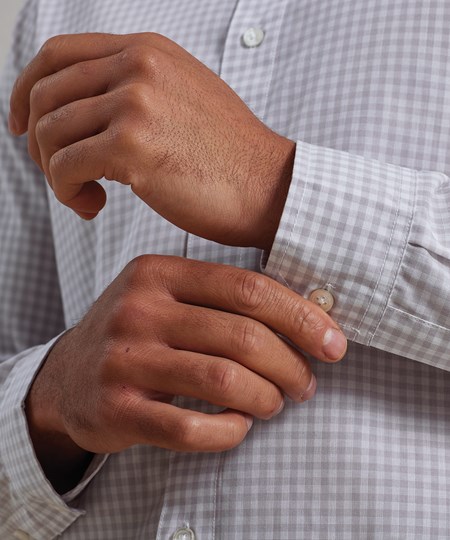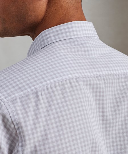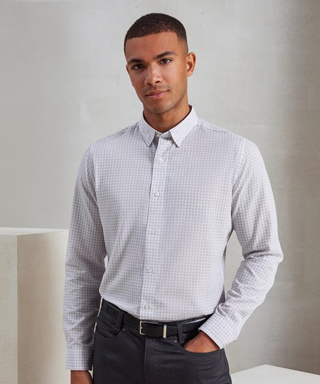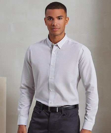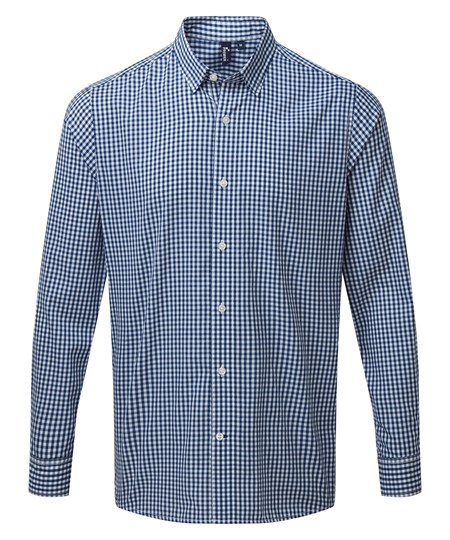 Een aantrekkelijk gingham patroon overhemd met lange mouwen in sterk contrasterende kleuren. Met enkele manchetknoop en mouwophouder. Afgewerkt met een smalle zachte kraag met ‘button-down’ optie aan de onderkant. Een strijkvrij, duurzaam, geruit herenoverhemd dat een vriendelijke, stijlvolle uitstraling geeft aan bedieningsmedewerkers.